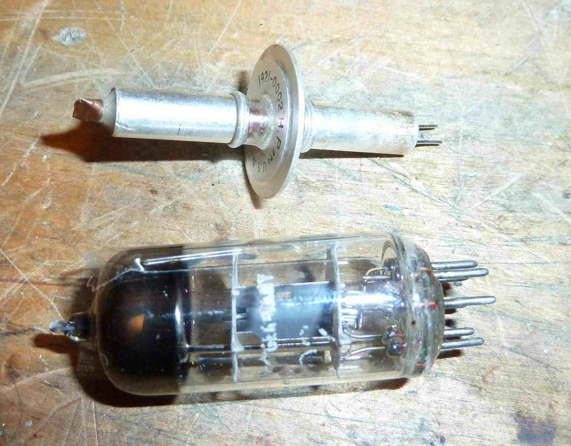 Nachdem ich heute noch die defekte Skalenlampe ersetzt und die Bereichswahl frisch geschmiert habe, ist das Gerät wieder voll einsatzfähig. Bei dieser Gelegenheit habe ich noch die UHF-Triode 5876 ausgebaut und fotografiert, so eine Bleistift-UHF-Röhre trifft man ja nicht alle Tage an. Im Bild als Vergleich dazu die Miniaturröhre EC92, die einiges bekannter sein dürfte. Bei der UHF-Triode (einsetzbar bis 1GHz) ist die Scheibe in der Mitte der Gitteranschluss, das Metallrohr links die Anode (ist gleichzeitig auch ein Gehäuseteil und sorgt so für die Kühlung) und entsprechend das rechte Rohr die Kathode. Die beiden dünnen Stifte rechts sind die Anschlüsse für die Heizung.
