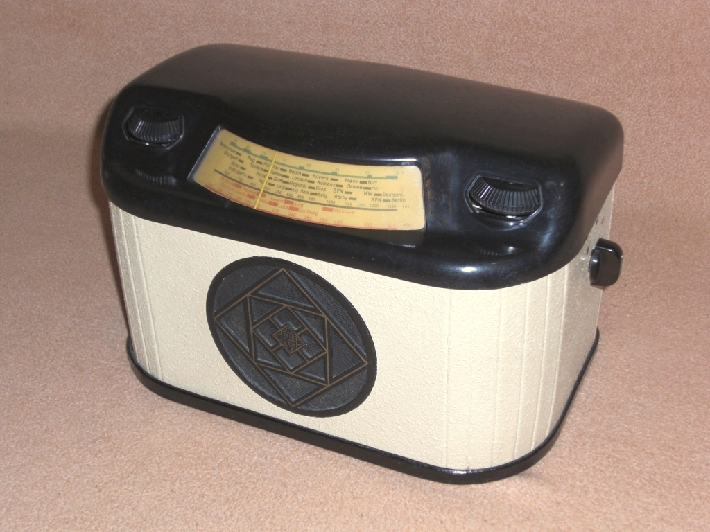 Das Gehäuse besteht unten als Sockel aus Holz, der Korpus ist aus lackierter Presspappe!!, die Abdeckung oben aus Bakelit. Das Ganze wird von mehreren Stahlstreben innen zusammengehalten. Weil das Ganze optisch bei den Kunden gut ankam, gab es dann später bei Telefunken einen zweiten Aufguss. Das Gerät hatte dann aber einen Kreis mehr, U Röhren und hieß Tango 5449GWK.