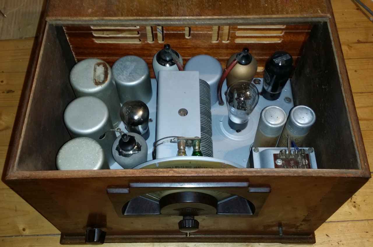 Tja, wie versprochen (bzw überredet) hier die Kurzvorstellung von meinem unfertigen Seibt. Technisch ist er restauriert und funktioniert auch top. Habe ich allerdings nicht selbst gemacht. Das Gerät verdanke ich einem guten (allseits bekannten) Radiofreund, der es für mich abgeholt hat und es sich auch nicht nehmen ließ, die Technik zu machen. Habe das Angebot dankend angenommen, weil er der "Vorkriegs-Experte" ist. Er wollte mir auch das Gehäuse aufarbeiten, das habe ich aber abgelehnt, damit ich wenigstens das selbst gemacht habe, sonst würde mir ja jeglicher Bezug zu dem Radio später fehlen. Das ist nun schon eine Weile her und weil ich nie zu nichts komme, sieht das Radio immer noch so aus, wie ich es bekommen habe. Lediglich die fehlende Rückwand habe ich nachgefertigt. Die fehlenden Knöpfe soll ich noch bekommen - da warte ich darauf, daß die "Knopf-Produktion" anläuft, selbst habe ich das noch nie gemacht. Ich besitze passend zum Gerät auch noch einen Seibt Lautsprecher als "Spende" extra dafür bekommen. Darf ich hier Namen nennen? Dann an dieser Stelle nochmal vielen Dank an Andreas für alles, was er für dieses Radio (und mich) getan hat.