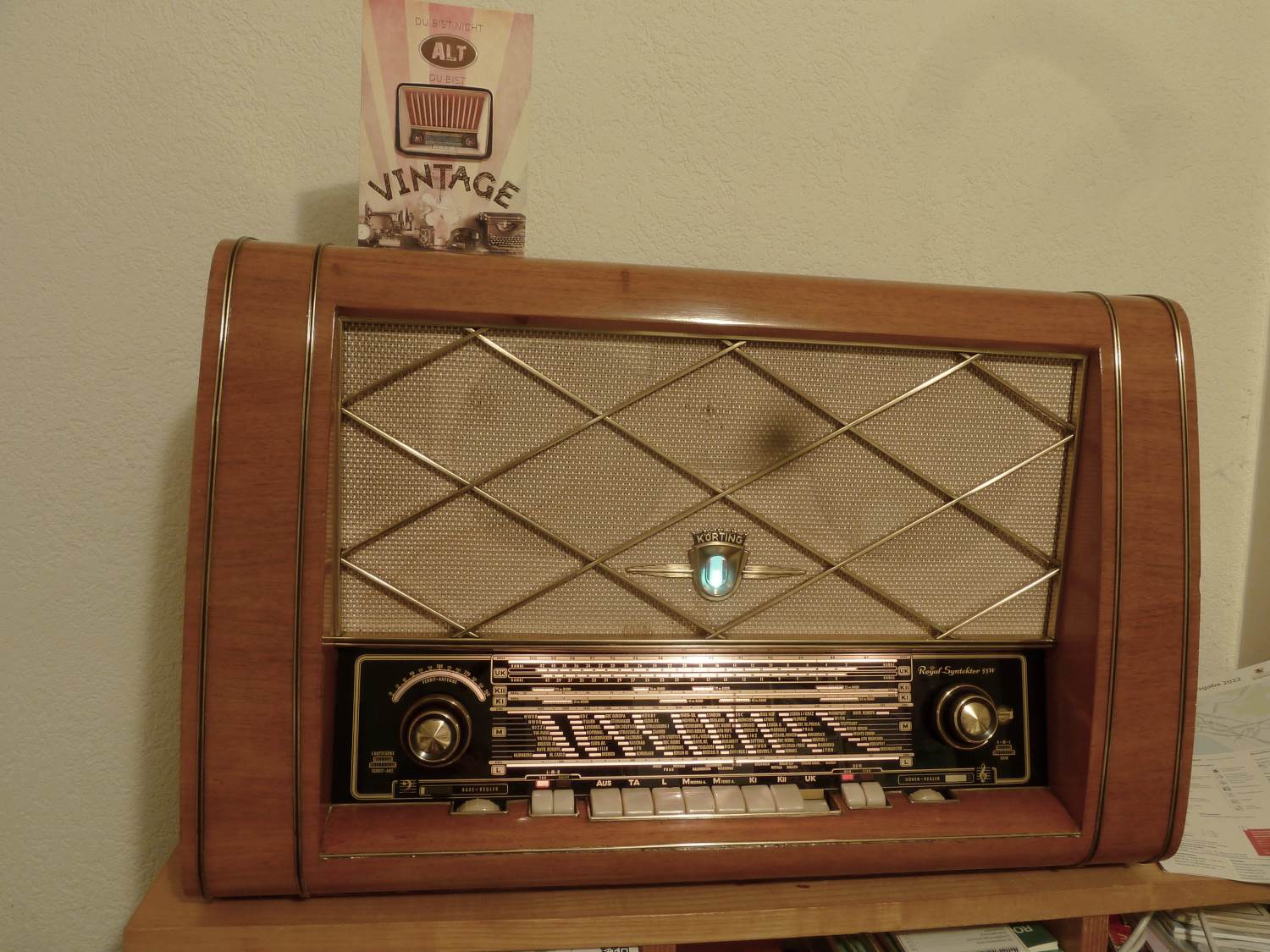 Der hat für AM und FM eine HF-Vorstufe, empfängt auf LW, MW, 2*KW und UKW und hat 3 ZF-Stufen für AM und 4 für FM. Für LW und MW hat er 10 Kreise, für KW 9 und für UKW 14 Kreise. Daneben gibt es eine Gegentakt-Endstufe, variable ZF-Bandbreite, Höhen- und Tiefenregler und für MW eine zuschaltbare Ferritantenne. Als weitere Besonderheit gibt es für AM die Tag-/Nacht-Umschaltung, welche in Stellung 'Nacht' die Empfindlichkeit reduziert und die Regelcharakteristik ändert, so dass bei Selektivschwund weniger hochgeregelt wird und so das dann verzerrte Signal weniger laut wird. Für UKW gibt es den Nah-/Fern-Schalter, in Stellung 'Nah' wird bei zu schwachem Signal stummgeschaltet, so dass das Rauschen unhörbar wird. Weitere Infos und Fotos zum Gerät gibt es hier: https://www.wumpus-gollum-forum.de/forum...&thread=290