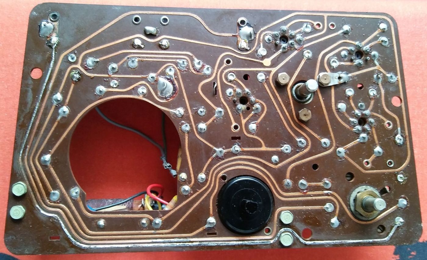 Grosse Überraschung war, dass die genietete Pertinaxplatine auf der anderen Seite komplett mit Leiterbahnen versehen war. Die Qualität des Schalters und des Potentiometers ist enorm. Sie erfüllen nach 60 Jahren mängelfrei ihren Zweck.