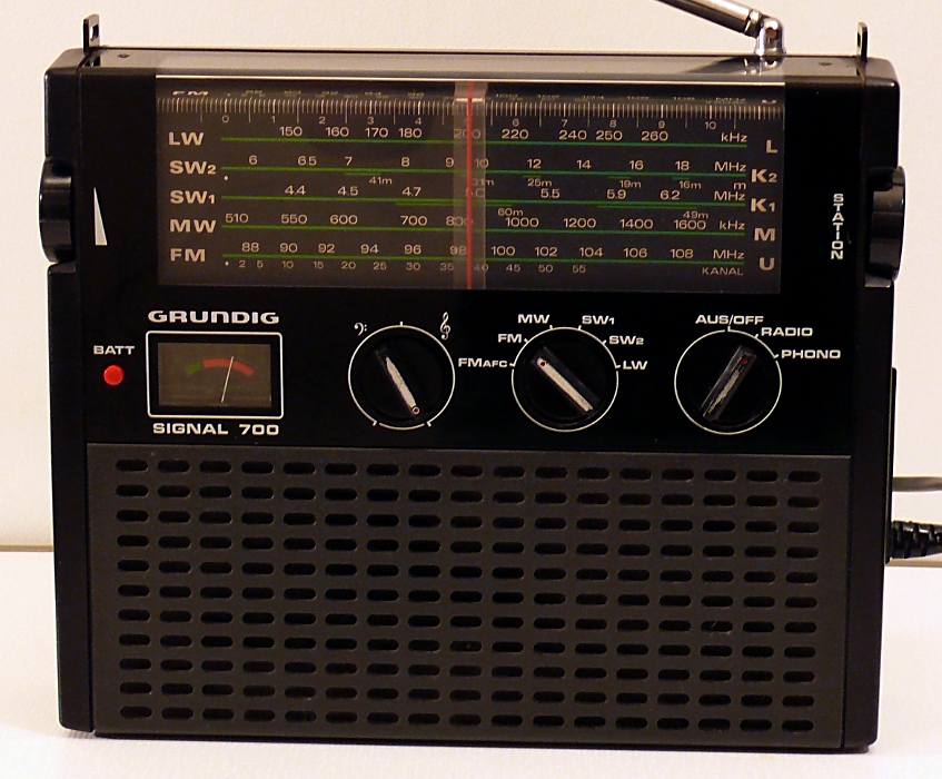 Herst. : Grundig Mod. : Signal 700 Jahr : 1974 - 1975 Bes. : LW, MW, 2 x KW, UKW Bem. : Netz- und Batteriespeisung (4 x 1,5 V), Thermoplastgehäuse, Kofferradio