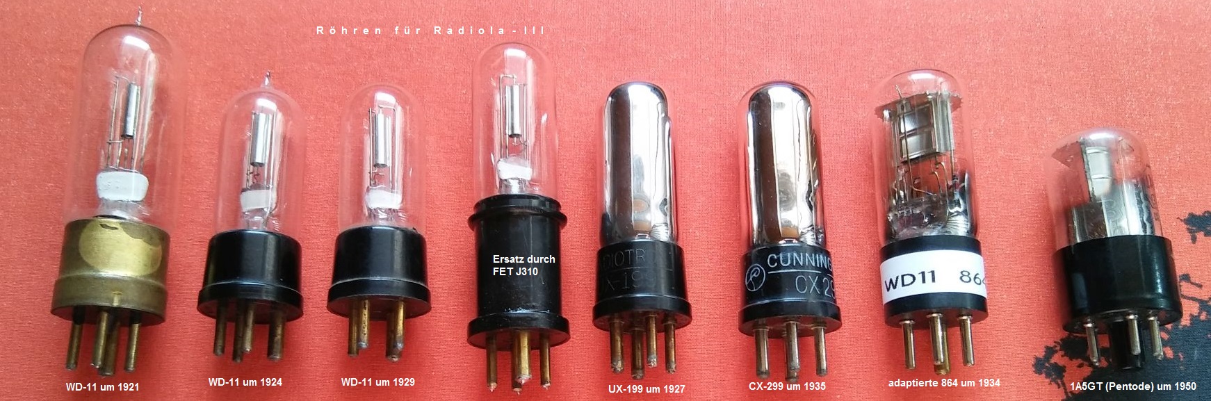 zu diesem alten Beitrag möchte ich noch erwähnen, dass eine US-amerikanische Firma die für die Luftfahrt entwickelte und mikrofoniearme 864 in einem WD-11 Sockel anbot, sodass sich ein Zwischenadapter erübrigte. Die WD-11 wurde 1924 sehr schnell fallen gelassen, weíl sie durch einen konstruktiven Fehler bei Heizfadenbruch einen der Heizanschlüsse mit der Anodenspannung verband und dadurch die zweite Röhre ebenfalls durchbrannte. Schlimmstenfalls auch Transformator und Variometer. Nach 1930 verschwand die bis heute teure WD-11 aus den Katalogen.