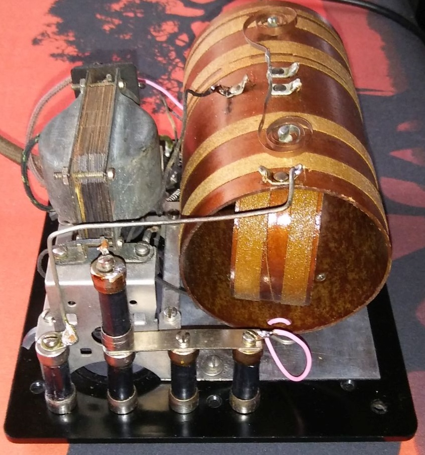 Die Abstimmung in diesem Empfänger erfolgt in der bewährten Variometerschaltung ohne Drehko. Auch die Rückkopplung erfolgt über ein weiteres Variometer (daher die beiden nebeneinander liegenden Regler). Die Heizspannung von 1,5V max wird über das große Poti eingestellt und soll bei den Röhren nur zu einem ganz dunkelroten Glühen führen (sieht man eigentlich nur bei fast vollständig gedimmten Licht); mehr schadet den sehr empfindlichen (und teuren) Rohren!
