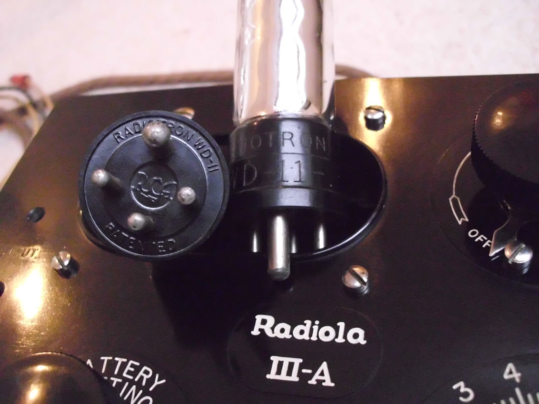 In diesem Gerät hier sind wiederum die originalen WD-11 als Röhren vorhanden, allerdings in der letzten ("modernsten") Bauform (schlanker Kolben, voll vergettert, kein sichtbarer Pumpstutzen). Ich habe die Röhren im Verstärkerteil mal gezogen, damit auch der Sockel sichtbar wird. RCA hat übrigens noch während des Produktionszyklus dieser Geräteserie Ergänzungsschaltpläne und Zwischensockel herausgegeben, damit die Geräte auf leistungsfähigere Röhren vom Kunden oder versierten Bastler umgestellt werden konnten. Die WD-11 waren zu empfindlich; ihr größter Nachteil war zudem, daß beim Durchbrennen eines Heizfadens dieser gegen die Anode schlug und einen Gesamtkurzschluß zwischen allen anderen Heizungen (die ja parallel geschaltet waren) und der Anodenspannungen erfolgte - ging also eine Röhre drauf, zog sie unter Umständen alle anderen mit in den Tod!