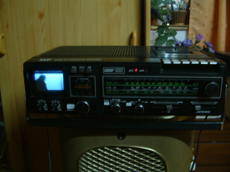 Die kleine NEC Bildröhre hat eine Diagonale von 84mm, sw Das Radio bietet UKW, K, M und gehört zu den etwas aufwendigeren Exemplaren, es empfängt in allen drei Bändern viel und gut. Alles ist Mono. Auch der Kassettenrekorder läßt keine Klagen zu. Ein Krokomesskabel daß einpolig vom Fernsehkabel zur Antenne geklemmt wird reicht ihm für sein Fernsehen. Das Bild ist gut und kontrastreich, aber wirklich klein. Garnicht dazu passend ist der voluminöse Ton den der Fernseher dem Radioteil zu verdanken hat, er nutzt dessen Tonstufe mit.