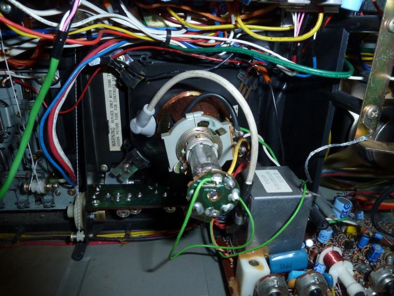 Bildröhre, sozusagen das Modell einer 'richtigen' Röhre im Massstab 1:6 Im Metallbecher rechts der Bildröhre ist der Zeilentrafo mit der Hochspannungskaskade, die Hochspannung beträgt 'nur' 6.5kV
