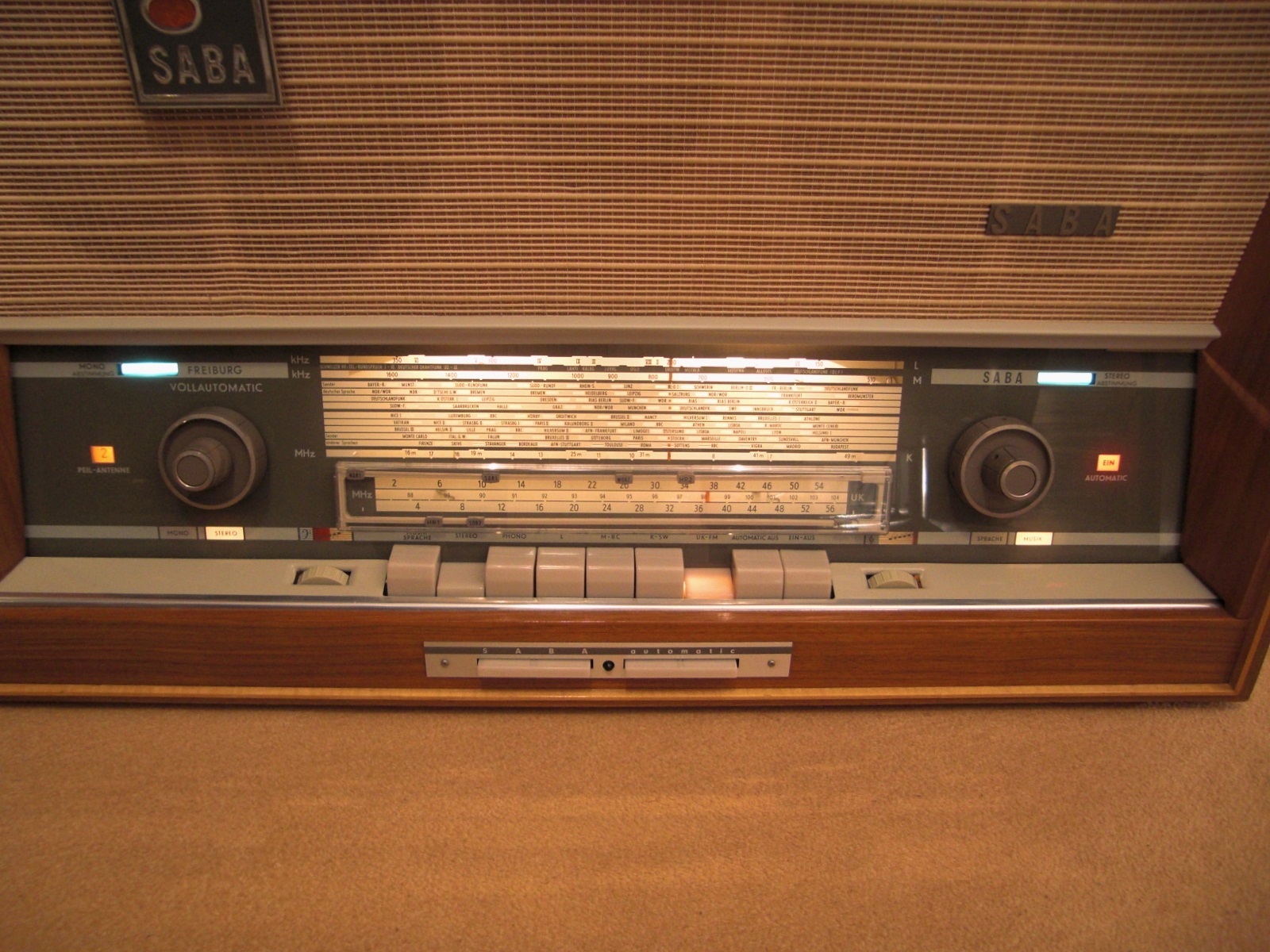 das letzte Gerät für heute das ich euch vorstellen möchte, ist ein weiterer Freiburg aus dem Hause Saba. Bei dem Radio handelt es sich um den Freiburg Vollautomatik 14 von 1963. Das Radio hat für AM 10 Kreise und für FM 13. Es ist das erste Saba, mit dem nicht nur Stereowiedergabe für Schallplatten möglich war, sondern auch für UKW. Man musste dafür allerdings einen zusätzlichen Stereodecoder kaufen. Dieser Decoder war schon volltransistorisiert und steuerte eine EM87 Röhre an, um Stereosender anzuzeigen. Er hatte allerdings gegenüber späteren Versionen noch den Nachteil, das der Signalpegel, gegenüber Monowiedergabe, etwas reduziert war. Außerdem musste man die Stereowiedergabe jedes Mal nach Betätigung des UKW-Bereiches, erneut aktivieren.