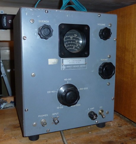 da Pendelempfänger offenbar immer noch ihren Reiz haben, stelle ich hier mal den wohl teuersten Pendelempfänger von HP vor. HP nennt ihn ganz trocken 'VHF-Detector', gedacht war er, an die VHF-Impedanzmessbrücke angeschlossen zu werden, um das Brücken-Null zu finden. Man kann ihn aber ganz gut zum KW- und UKW-Empfang benutzen. Ergattert hatte ich dieses Gerät Anfang der 90er-Jahre zusammen mit der VHF-Messbrücke im Sperrmüll der ETH Zürich. Interessant ist noch die Tatsache, dass das Gerät für 220V Netzspannung ausgelegt ist, obwohl auf dem Gehäuse 110V steht und auch nach Bedienungsanleitung und Schaltplan 220V nicht vorgesehen sind. Weiter hat jemand die Klinkenbuchse für den Kopfhöreranschluss durch einen Twinax-Stecker ersetzt. Auch das Netzkabel dürfte nicht mehr original sein.