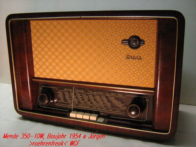 Bild 6: Traurig - sehr traurig sah dieser ´54er Mende 350-10W aus, als ich ihn vor über 20 Jahren in einer Schrottsammlung fand. Keine Röhre mehr drin, das Gehäuse total ramponiert... Eine Heidenarbeit ´reingesteckt, aber es hat sich gelohnt. Die Röhrenbestückung: ECC85, ECH81, ECH81, EF85, EABC80, EL41 und EM34. Es handelt sich dabei um eine modifizierte Version, dessen ursprüngliches UKW-Teil stillgelegt und durch einen Umrüstsatz ersetzt wurde.