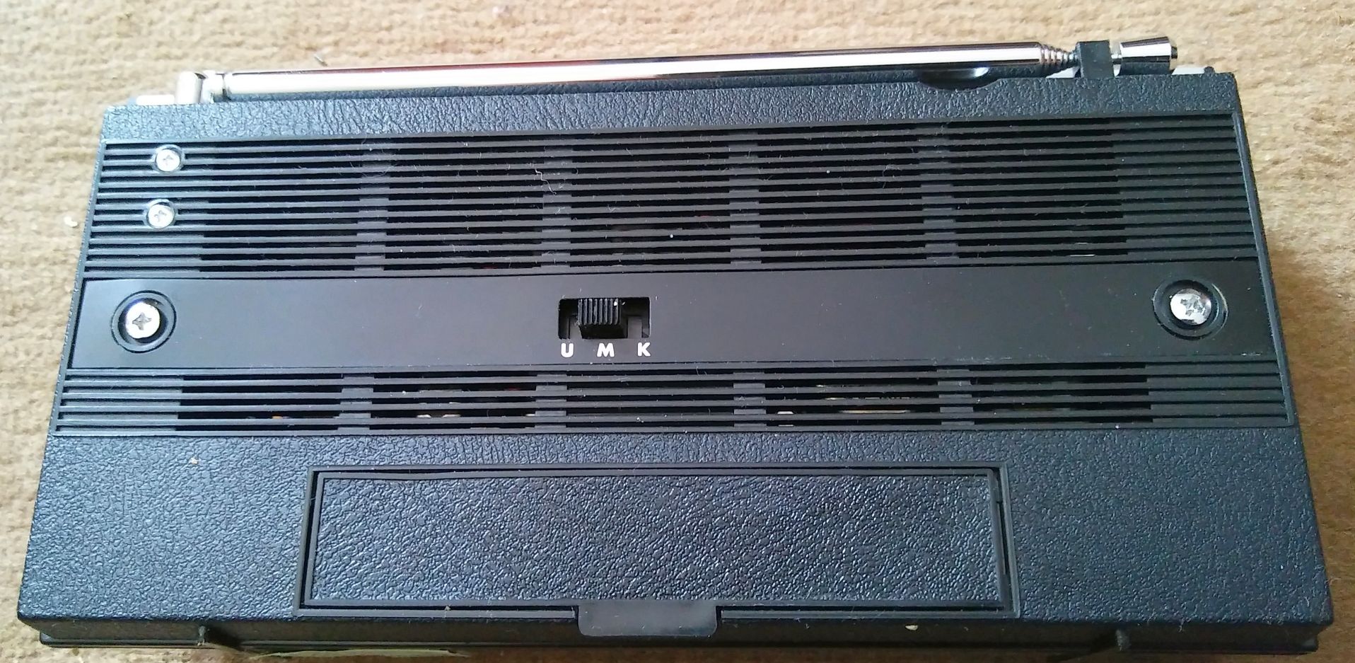 Schaltung: Superhet Transistoren: 9 Germanium (2x 2SA240, 2SA433A, 2x 2SA77, 2x 2SB54, 2x SB56) Kreise: AM: 6, UKW: 7 Frequenzen: KW 5,8-7,35 MHz, MW, UKW bis 104 MHz Lautsprecher: 1 oval (9,5 x 5,5 cm, 8 Ohm) Spannungen: 4 x 1,5 Volt Mignon Gehäuse: Thermoplast schwarz Skala: Analog in horizontaler Zeiger-Laufrichtung. Abstimmung: Drehkondensator Komfort: Tonblende-Umschalter Gewicht: 0,8 kg Maße: 19,0 x 9,5 x 5,0 cm Besonderheit: Kurzwelle mit Ferritantenne