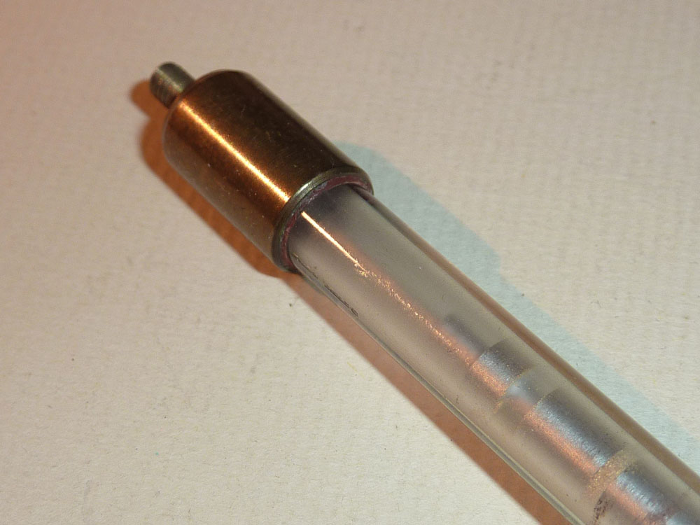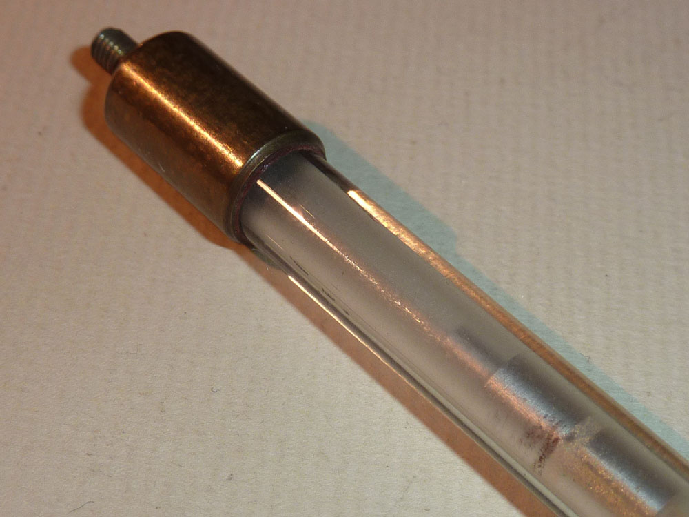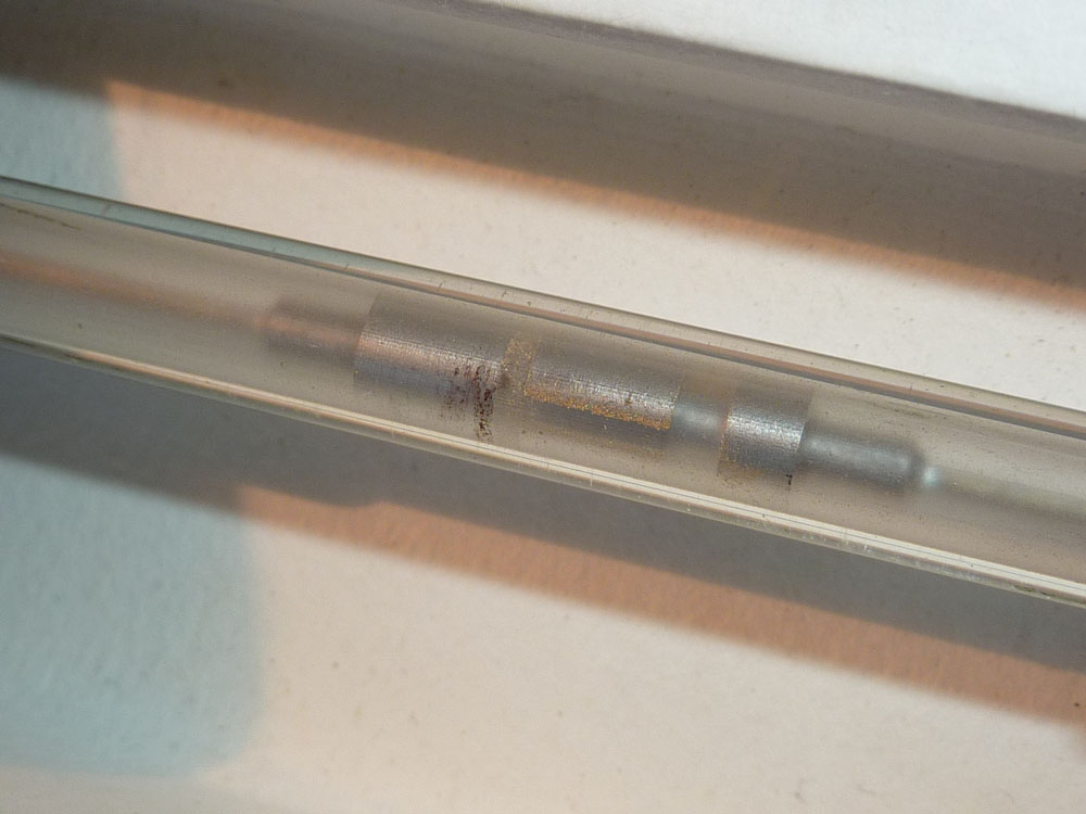 der französische Kohärer wirkt an den Elektroden eher wie eine Replik. Das sieht innen nach einer modernen Fertigung aus. Warum diese Unsymmetrie ?? ....diese ist technisch nicht nachvollziebar. Die Späne sehen nach Nickel / Silber aus... der frühe Branly war mit Eisenspänen gefüllt und nicht luftleer. Branly war Physiker.... kommerziell wurde dieses Prinzip durch entsprechende Firmen angeboten. ( Siehe Bernds Link )