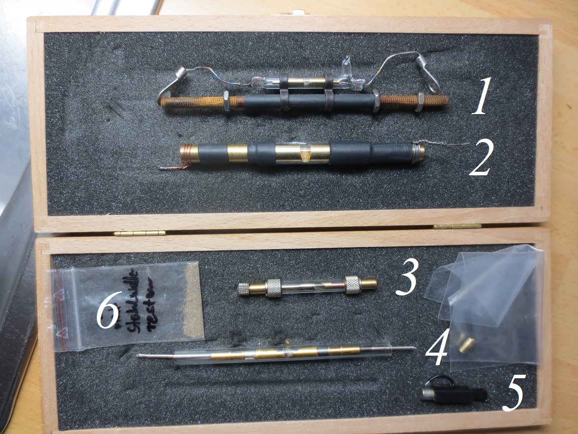 Hier ein Leckerbissen von einer polnischen Seite: "Acht unterschiedliche Kohärer im Stil der Graf von Arco Gesellschaft ! " Sieben mit unterschiedlichen Elektrodenabständen abgebildet. Kasten hatte mal 10 Stk. Vorn ist ein Leerzeichen eingefügt. h t t p s://artsandculture.google.com/asset/eight-coherers-in-the-style-of-georg-graf-von-arco-gesellschaft-f%C3%BCr-drahtlose-telegraphie-m-b-h-system-telefunken-1903-1923/LAG4kpXTnmdLnQ?hl=pl&ms=%7B%22x%22%3A0.5224508273681716%2C%22y%22%3A0.6399815985230418%2C%22z%22%3A10.5%2C%22size%22%3A%7B%22width%22%3A0.5087397588376813%2C%22height%22%3A0.3371485132697458%7D%7D