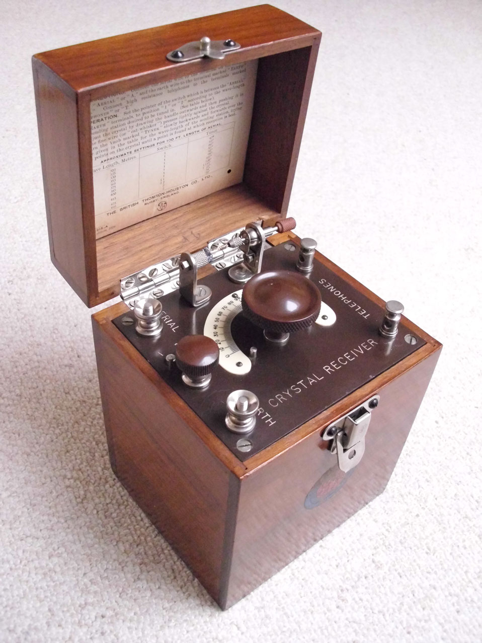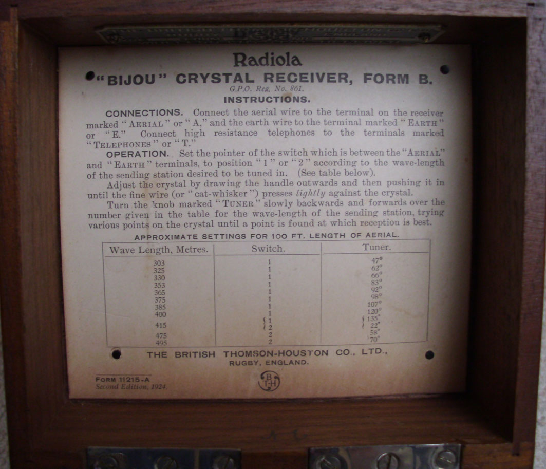 ich konnte einfach nicht widerstehen und habe mir aus der Bucht (GB) diesen sehr hübschen und "very british" aussehenden Detektor der Marke "BTH" von 1924 kommen lassen. Das Herstellungsjahr ergibt sich aus der Bedienungsanleitung, die in den aufklappbaren Deckel eingelassen ist.