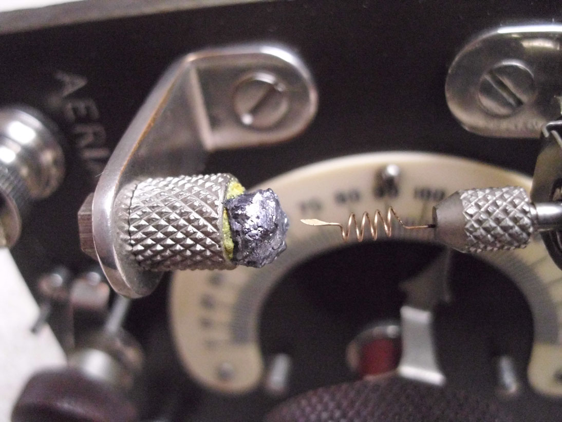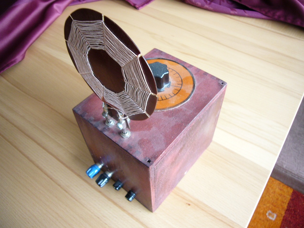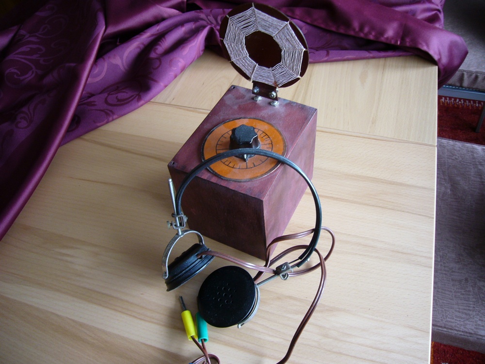 Alle Teile sind original und unverfummelt (siehe auch das Abtastdrähtchen für den Kristall). Gestern abend habe ich mit dem Kästchen gehört und konnte (sogar ohne Erde!) zwei englischsprachige Sender, einen Holländer und einen Franzosen hören (zwar mit Fading, aber sogar einigermaßen trennscharf)