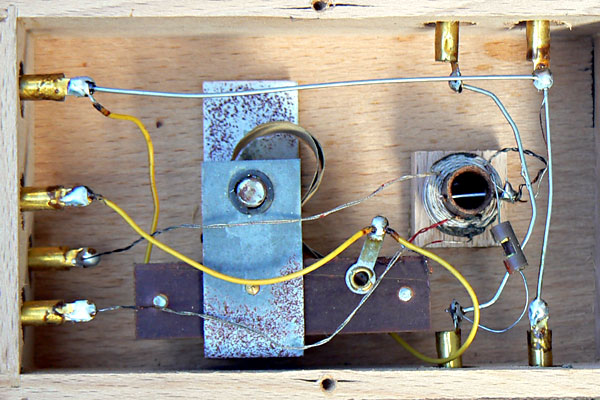 Erwähnenswert ist die offene Diode und, der Not der damaligen Zeit geschuldet, der Wickeldrehko. Er besteht aus zwei Alufolien mit Isolationszwischenlage.