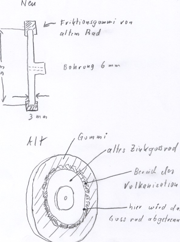 Hallo Rainer, kostet nix, allerdings benötige ich das alte Rad, da dessen Friktionsgummi wieder verwendet wird. Ich versuche die gestrige Vorgehensweise anhand einer " Schmierskizze " zu verdeutlichen. Ebenfalls benötige ich die Welle / den Stift des Rades um eine leichtgängige aber spielfreie Bohrung passend zur individuellen Welle zu fertigen. Ein Risiko liegt im Abtrennen des Gummis vom alten Rad. Hier gilt, je bröseliger das ist, umso besser geht es. Grüsse Franz