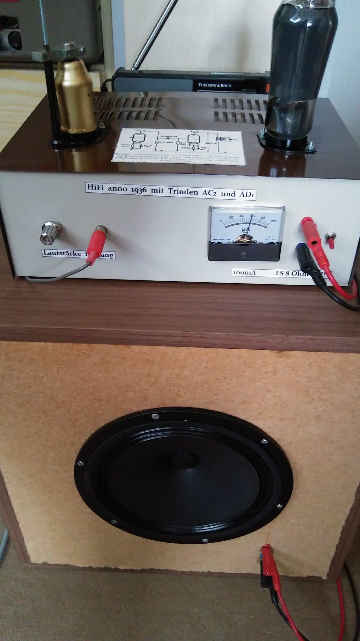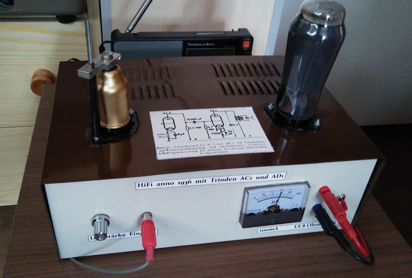 ja, der Gitteranschluss (nicht Anode!) ist solide, bombensicher! Trotzdem brummt es nicht. Die AC2 braucht schon ein paar 100 Millivolt am Eingang, damit die AD1 als Eintakt-A-Endstufe (Leistungsaufnahme 18W) ihre 4 Watt NF abgibt.