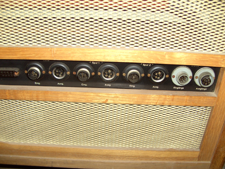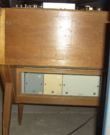 Im Schrank sind unterhalb der Maschine die Einschübe für Aufnahme/Wiedergabeentzerrung, HF-Löschung und Vormagnetisierung untergebracht. Sie werden mit den typischen T-förmigen Studioschlüsseln verriegelt. Im Innern des Schrankes ist noch das Netzteil und die Gleichstromversorgung für die Maschine vorhanden. Wie die Rückseite zeigt, kann der Schrank auch für Stereotechnik verwendet werden.