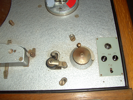 heute möchte ich aus meiner Sammlung die Studiobandmaschine Saja 100 in der Version R 28/2 von 1958 vorstellen. Die Firma Sander & Janzen, Berlin baute ab 1949? die Studiobandmaschine SJ100. Mit der Rundfunkbezeichnung R28 war sie in mehreren Varianten fast 20 Jahre die zuverlässige Standardmaschine des DDR-Rundfunks. Vorher hatte man auch hier die AEG K8 und eventuell ältere Bestände. Später nannte sich die Firma Turow KG und VEB Tontechnik Berlin, immer in der Sonnenburger Strasse. Meine R 28/2 war nicht im Rundfunk eingesetzt. Die Bohrungen zur Befestigung der Rdf-Nummer sind zwar genauso wie diejenigen für das Typenschild vorhanden, die Schilder aber nicht. Dem Aussehen nach waren sie auch nie vorhanden. Die Maschine ist in einen Holzschrank mit spitzen Füssen, der damaligen Mode entsprechend, eingebaut. Sie ist komplett bis auf die Wickelteller, aber noch nicht funktionsfähig. Bemerkenswert ist, dass die Wickelteller im Gegensatz zur damaligen Bedienungsanleitung nur einen Durchmesser von max. 29,5cm haben können. AEG verwendete immer 30er Teller. Alle anderen mir bekannten Ostblockmaschinen verwenden auch Wickelteller mit ca. 29cm Durchmesser. Der übliche Durchmesser eines 1000m Bandwickels ist um 28cm. Der Wickelteller auf dem Foto gehört nicht dazu und passt auch nicht. Eine Bandmaschine würde auch ohne Wickelteller laufen. Der Teller dient hauptsächlich dazu eventuell beim Bandauflegen herunterfallende Windungen aufzufangen. Beim Betrieb wird der Wickelteller vom Band nicht berührt. Gleiches gilt für Spulenbetrieb, vorausgesetzt der Bandlauf ist ordnungsgemäss eingestellt.
