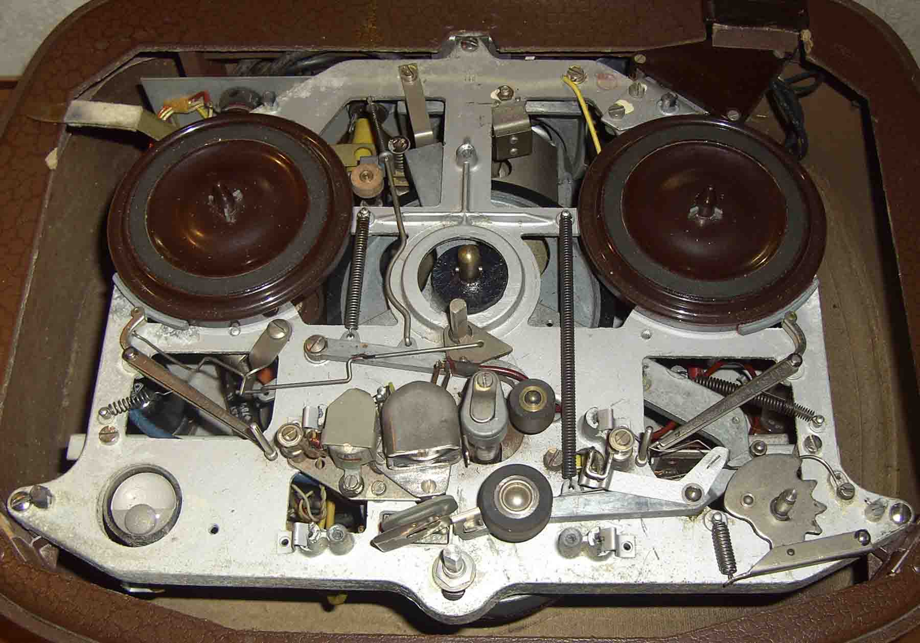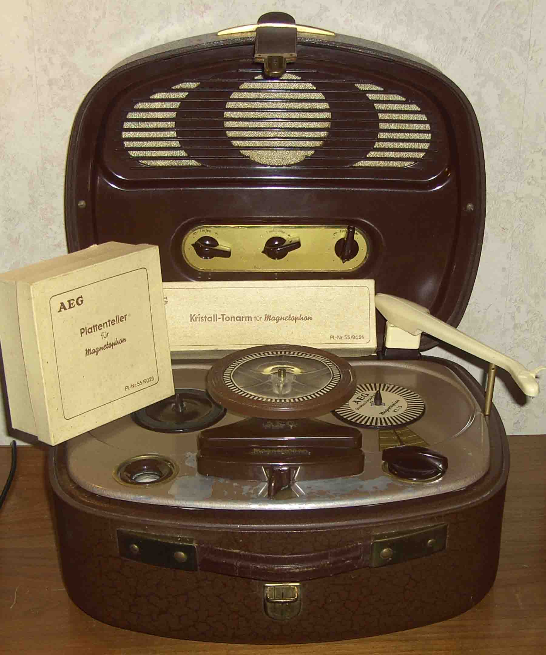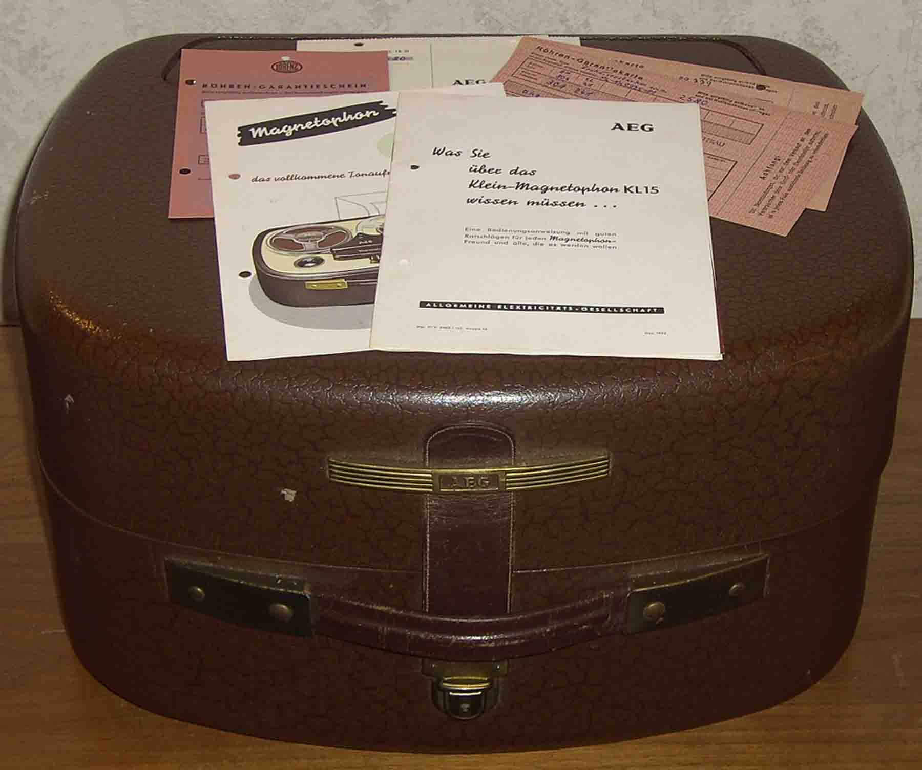 hier möchte ich das KL 15 vorstellen, welches 1951 das erstes AEG-Heimton- bandgerät war. Mein Gerät KL 15D ist eine spätere Version mit Verstärker und Lautsprecher im Deckel. Das Tonbandgerät arbeitet mit der Bandgeschwindigkeit 19 cm/s in Halbspurtechnik und deutscher Spurlage. Der Frequenzbereich geht, wie damals üblich, von 50 bis 10.000 Hz. Es können Spulen bis 18 cm Durchmesser verwendet werden. Eine Besonderheit ist, daß das Gerät mit entsprechendem Zubehör als Platten- spieler mit 78 U/min verwendet werden kann. Auch eine Verwendung als Diktiergerät ist vorgesehen. Dazu kann ein Diktathebel aufgesteckt werden. Durch Benutzung dieses Hebels kann bei Wiedergabe der Bandlauf unterbrochen werden oder man kann das Band kurz zurück laufen lassen. Dabei braucht der Betriebsartenschalter nicht betätigt werden. Das Gerät besitzt eine Bandendabschaltung. Für die Aufnahme wird ein Röhrenradio benötigt. Das Tonbandgerät wird mit dem beigefügten Anschlußkabel mit dem Lautsprecherausgang verbunden und die Aufsprechspannung muß mit dem Lautstärkeregler des Radios eingestellt werden. Die Kontrolle erfolgt mit dem Magischen Fächer am Tonbandgerät. Dazu ist noch zu bemerken, daß mit dem vorhandenen Löschkopf automatisch vorhandene Aufnahmen gelöscht werden. Nach der Aufnahme kann das Band zurückgespult oder für Aufnahmen auf Spur 2 gewendet werden. Ein Nachteil des Gerätes ist, daß die Geschwindigkeit stroposkopisch mit einem Hebel nachgeregelt werden muß. Wie auf den Bildern ersichtlich, hat das Tonbandgerät einige Mängel. Die Farbe der Frontplatte blättert teilweise ab. Wahrscheinlich wurde das Blech vor der Lackierung nicht ausreichend gereinigt. An der Lautsprecherblende fehlt eine Strebe, die durch Schließen des Deckels bei aufgestecktem Diktathebel herausgebrochen sein kann. Sonst ist das Gerät für sein Alter in einem guten Zustand.