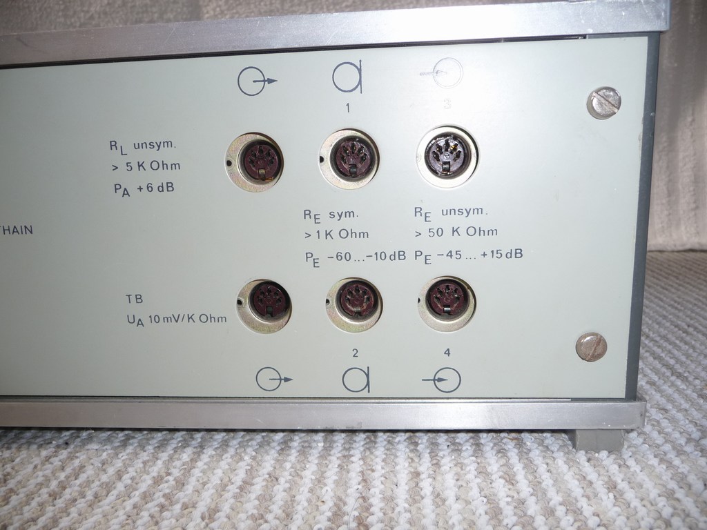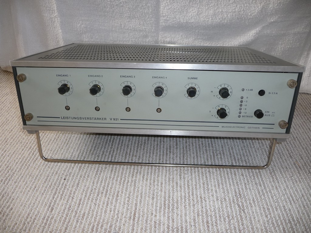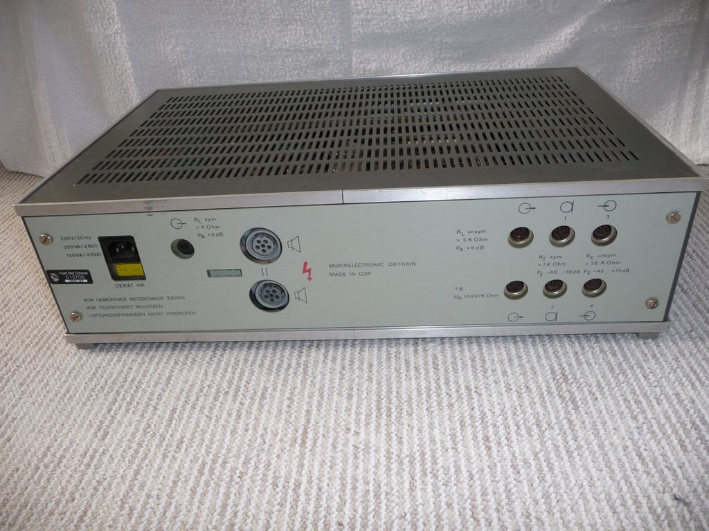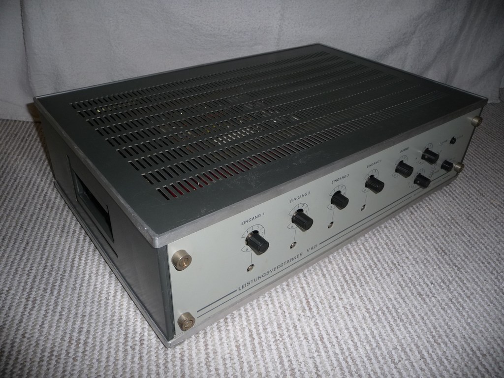 Ich möchte hier mal meinen V921 vorstellen. Der V921 ist ein Mischverstärker mit 4 mischbaren Eingängen. Es gab ihn auch als V941 nur als Endverstärker. Der Verstärker ist in 100 Volt ELA (Elektroakustische Anlage) ausgeführt, der Lautsprecherausgang hat 100 Ohm. Er ist aber durch Umlöten sekundärseitiger Brücken am Ausgangstrafo auch auf 6 Ohm einzurichten. Die Ausgangsleistung ist 100 Watt Sinus. (Mischverstärker V920 und Endverstärker V940 mit 50 Watt Sinus.) Eingebaut ist er in einem 19 Zoll Industriegehäuse, das Baujahr ist etwa 1982.