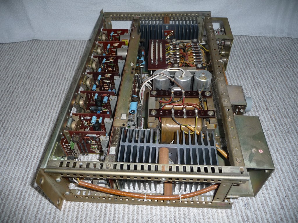 Vorn links Aussteuerungsanzeige, jeweils darüber Klangreglung, Sammelschienenverstärker, und die vier Vorverstärker. Rechts daneben an der breiten Metallschiene der Zwischenverstärker und elektronische Sicherung. Daneben Külkörper Endstufe, darüber Netztrafo, Elkos, Ausgangstrafo, Kühlkörper Endstufe.