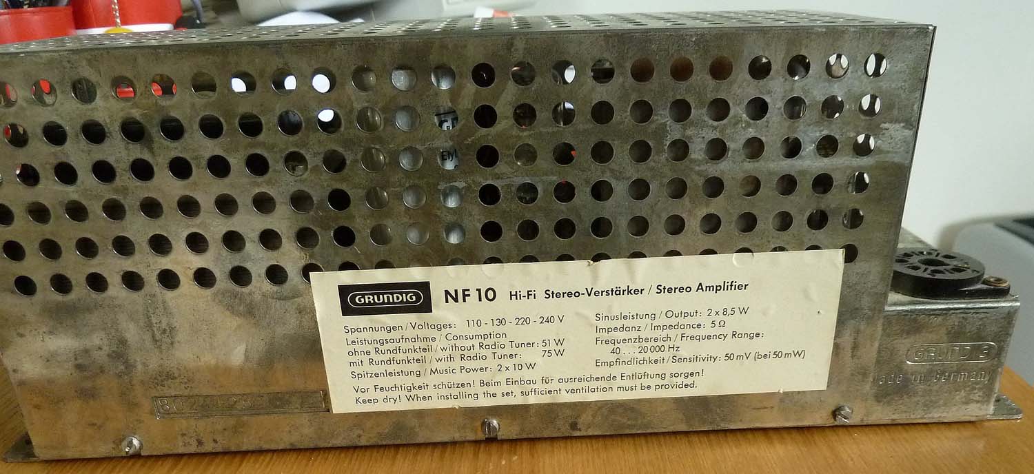 hier die Vorstellung meines Grundig NF10. Dies ist ein Stereo-Gegentaktverstärker, der auch noch einen Anschluss zur Speisung eines Röhren-Tuners hat. Den hatte ich ebenfalls, er fiel aber dem Bastler-Trieb zum Opfer... Wie er hiess, weiss ich nicht mehr, aber er hatte nur eine Front mit Skalenscheibe und den üblichen Bedienelementen, aber kein Gehäuse, und war für den Einbau in ein Musik-Möbel gedacht.