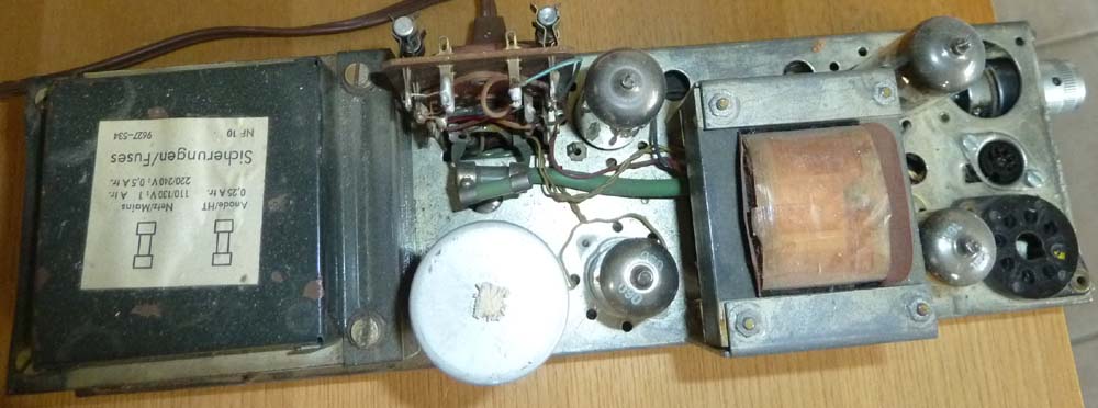 Die Oktal-Röhrenfassung ist für den Anschluss des Tuners gedacht und liefert die Speisung, für die NF ist die Din-Buchse. Im Loch daneben war original ebenfalls eine Oktal-Fassung für den Lautsprecheranschluss, wenn man nicht die Din-Anschlüsse auf der Seite nutzen wollte.