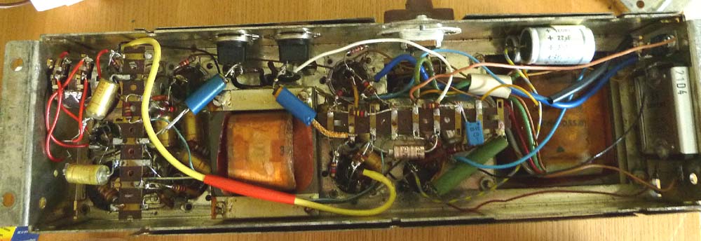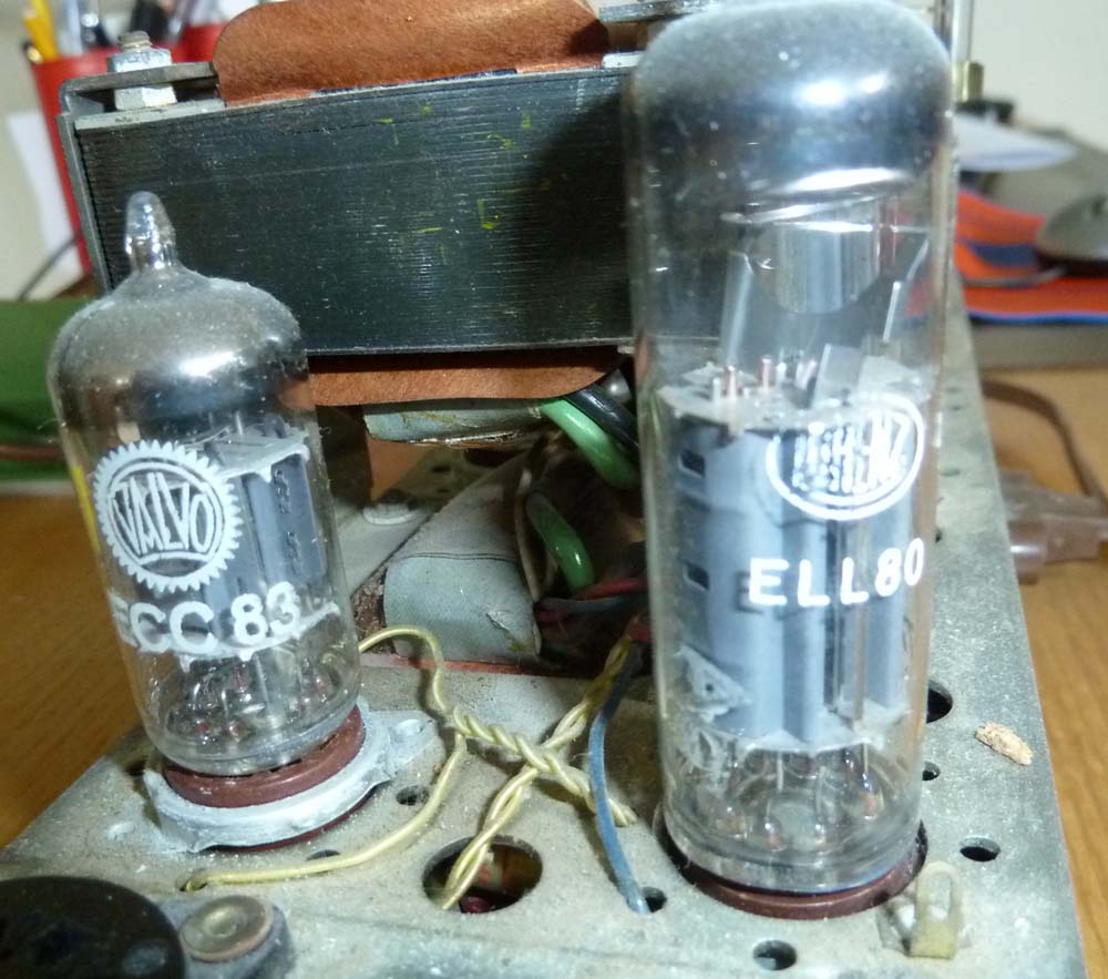 Der Verstärker hat zwei identische Kanäle, welche mit je einer ECC83 als Vorverstärker und Phasendreher und einer ELL80 als Gegentakt-Endstufe aufgebaut sind. Bedienelemente gibt es keine, das Lautstärkepoti habe ich mal nachgerüstet, da dieser Verstärker für Versuche ganz praktisch ist. Bis vor ein paar Jahren war er im normalen 'HIFI-Alltag' im Einsatz, und die ELL80 sind immer noch gut, obwohl sie nicht den besten Ruf haben, was die Lebensdauer angeht. Zur Schonung der Röhren hatte ich vor längerer Zeit eine Art 'elektronischer Urdox' eingebaut, um den Heizstrom beim Einschalten und damit das helle Aufglühen von Teilen der Heizfäden zu begrenzen. Realisiert ist das mit einem MOSFET, einem kleinen Elko, einer Diode und einem Widerstand und diskret neben dem Gleichrichter versteckt. Nach Herstellerangaben liefert der Verstärker 8.5W pro Kanal, gemessen habe ich etwa 6W. Die Audio-Qualität ist für die Einfachheit des Geräts sehr gut und das Signal praktisch brummfrei. Für einen satten Bass ist die untere Grenzfrequenz etwas hoch, die 40Hz nach Typenschild sind etwas optimistisch tief. Eventuell sind auch die Kathoden-Elkos mitschuldig, die sind (wie alle anderen Bauteile) Original.