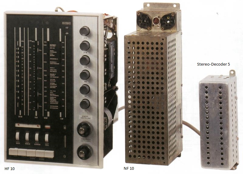 hier ein Bild der kompletten Gruppe, HF 10, NF 10 und Stereo-Decoder 5. Das waren noch Zeiten, wo man sich seine eigenen Anlagen zusammenbauen konnte, (wenn man konnte...). @Rainer: findest Du unter 11453, mit PDF-Dateien und Schaltbild HF 10 in Ausstellung.
