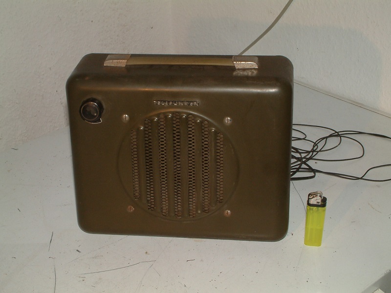 tragbarer Lautsprecher von Telefunken, hat einen niederohmigen Lautsprecher sowie einen kleinen Übertrager nebst dreistufigem Drehschalter zur Einstellung der Lautstärke. Sehr audiophil gebaut, aus gutem Blech, mit NATO-Farbe