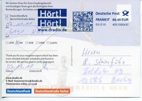 Deshalb habe ich heute einen Empfangsbericht an Deutschlandradio geschickt, mit der Bitte um eine QSL-Karte. In Form einer email an hoererservice@dradio.de mit PDF-Anhang.