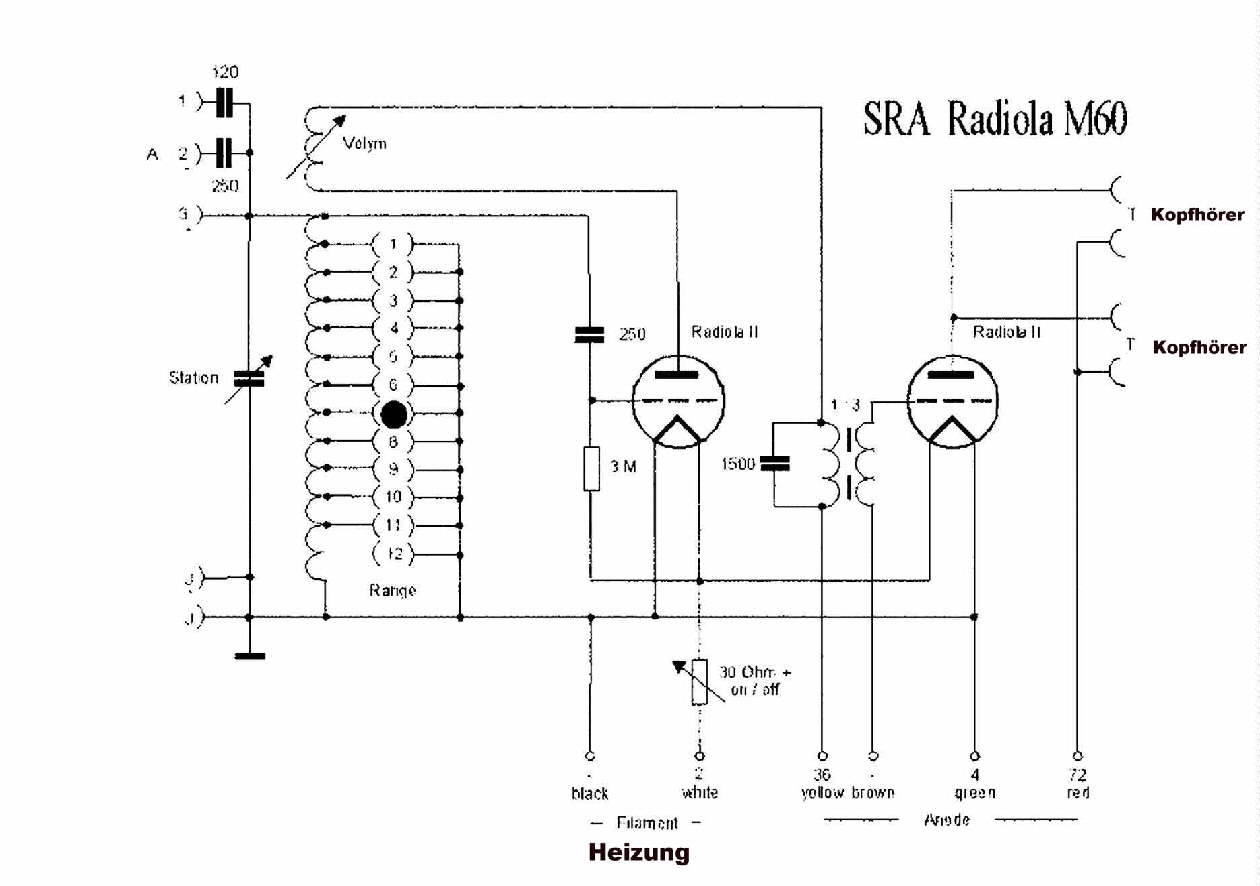 Der braune Draht führt auf eine Batterie mit Minus 4 Volt für die Gittervorspannung der Endröhre. Bei der Radiola M40 wird hierzu die Batterie der Heizung benutzt, die M60 hat eine 2 Volt- Heizung, die separat geführt ist. Die Anodenspannung direkt über den Kopfhörer zu führen war Mitte der zwanziger Jahre gängige Praxis. Peters Radiola könnte mit Widerstandskopplung arbeiten, deshalb eine Röhre mehr.