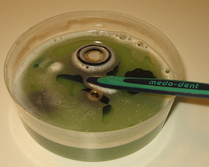 Die Knöpfe werden mit Zahnprothesenreiniger gereinigt.