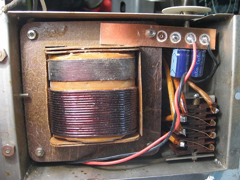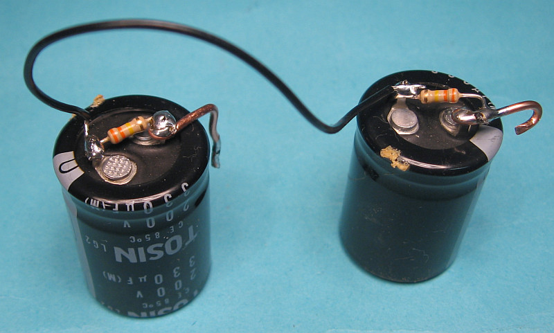Der neue Siebelko aus zwei in Serie geschalteten Kondensatoren aus einem PC-Schaltnetzteil. Die Kapazität ist viel größer als ursprünglich, was nichts ausmacht. Hauptsache, die Spannungsfestigkeit simmt. Hier sin nun 400 Volt erreicht.