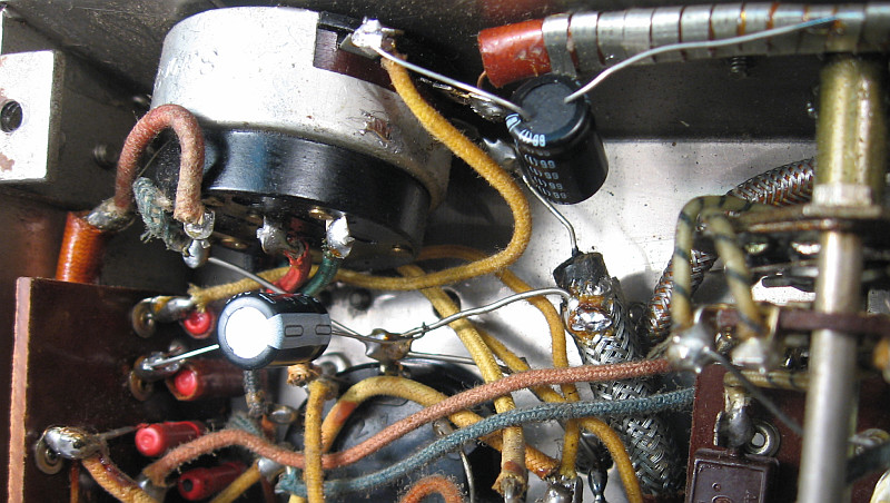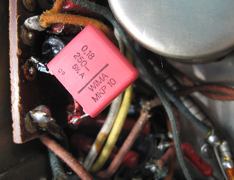 Dem Koppelkondensator zum Steuergitter der NF-End-Röhre wurde ein moderner Kunststofffolienkondensator in Serie geschaltet, damit Leckströme den Arbeitspunkt der NF-Endröhre nicht verändern können, was zu einem hohen Anodenstrom führen könnte.