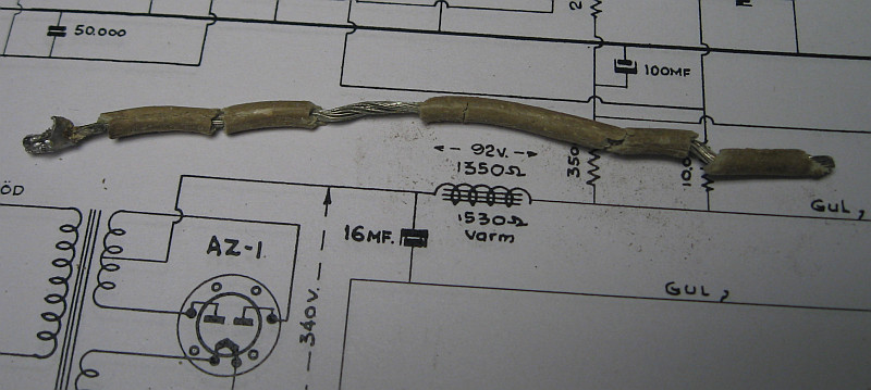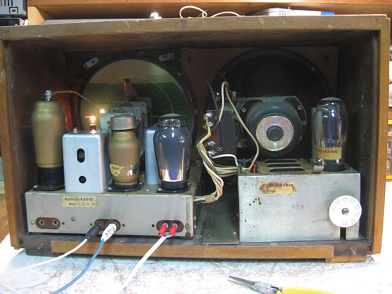 Von dem gestrigen "Schock" hatte ich mich inzwischen erholt, weil das Radio auf Langwelle unempfindlich ist. Die Ursache ist die Eingangsspule, welche durch Gewitter beschädigt wurde. Das ist ein typischer Fehler für Radios meiner Gegend, denn damals wurde in Motala ein Langwellensender betrieben, denn die meisten Radiohörer an einer Außenantenne hörten. Es muss kein Blitzschlag sein. Es reicht schon eine Überspannung durch ein aufkommendes Gewitter. In meinem Radio hatte es auch schon einmal einen blauen Blitz gegeben. Zum Glück ist nichts passiert. Die Langwelle werde ich ein andermal reparieren, da die Eingangspule in Kreuzwickeltechnik neu gewickelt werden muss.
