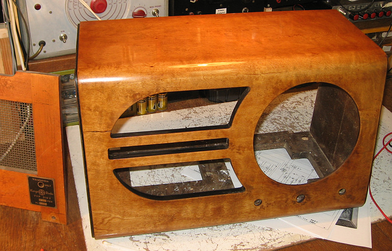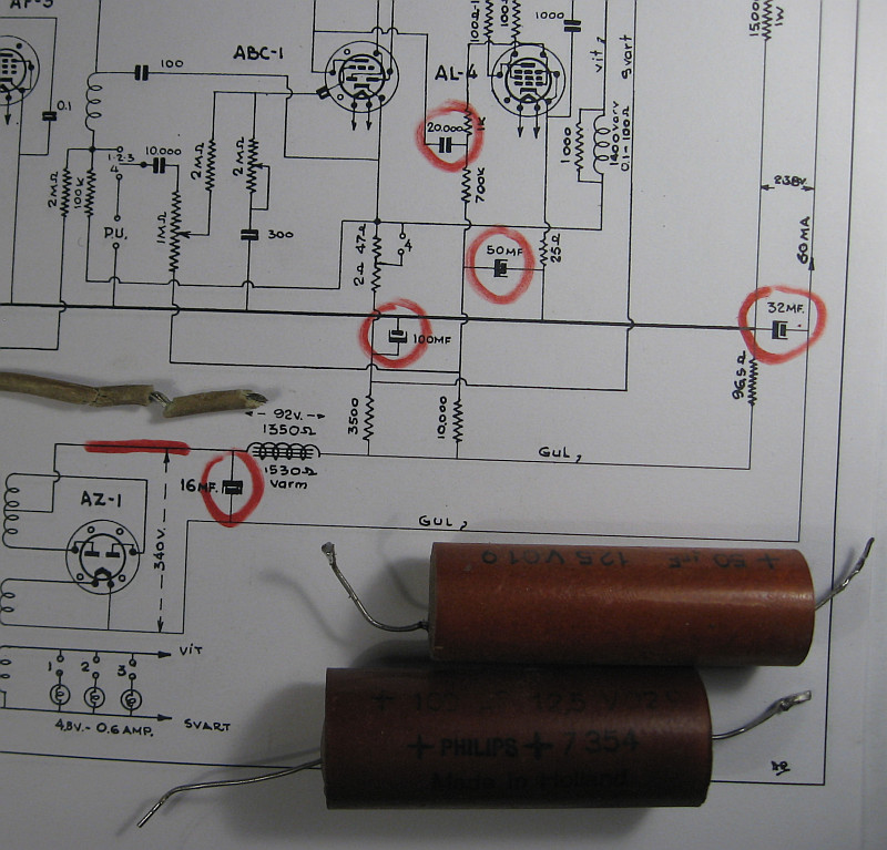 nun sind alle kritischen Bauteile ausgetauscht. Sämtliche Elkos waren ausgetrocknet. Dem Koppelkondensator zum Steuergitter der NF-Endröhre wurde ein neuer Kondensator in Serie geschaltet. Die Verdrahtung sieht jetzt nicht mehr ursprünglich aus. Es geht aber jetzt erst einmal darum, das 75 Jahre alte Radio zum Funktionieren zu bringen, ohne dass es in Rauch in Flammen aufgeht.