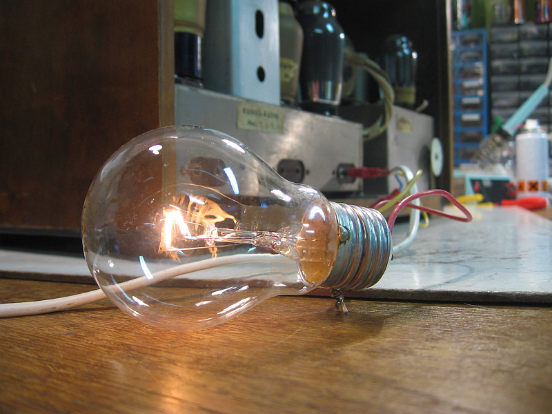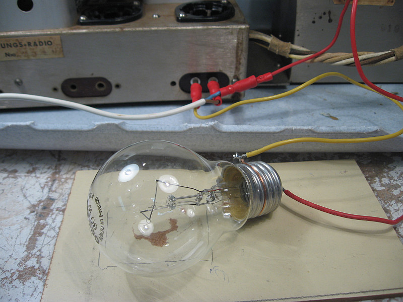 Erstes Einschalten über eine 60-Watt-Glühbirne in Serie. Noch sind keine Röhren eingesteckt. Die Glühbirne glüht noch nicht. Ein gutes Zeichen. Vorher hatte ich den Netztrafo mit dem Ohmmeter gemessen.