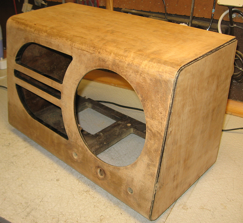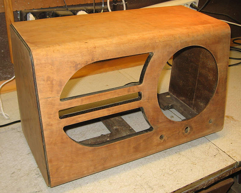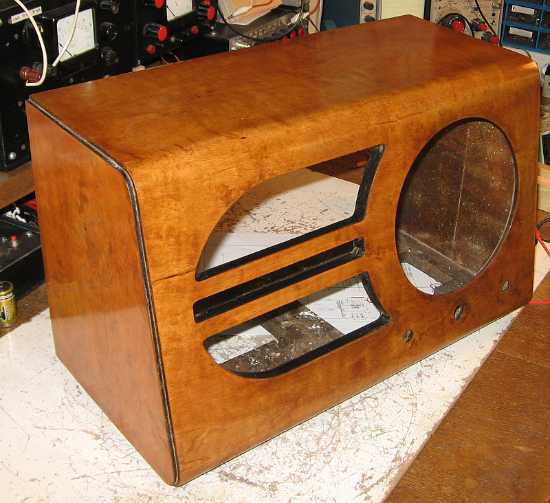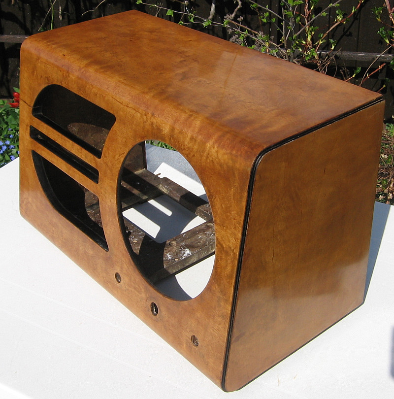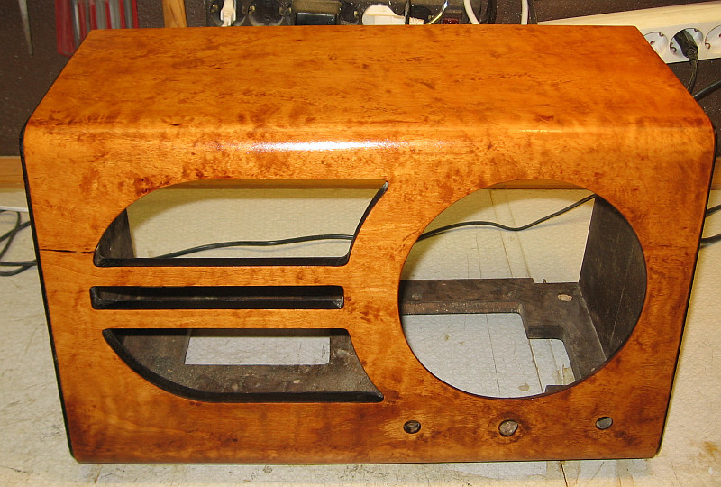 Mit Schellack poliertes Gehäuse. Die Rückwand dient zum Vergleich des Farbtons.