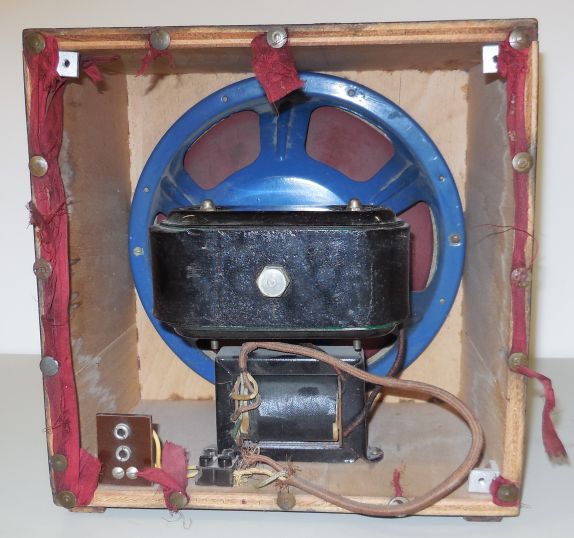 so, jetzt ist auch der Lautsprecher aufgetaucht. Leider gibt es weder auf dem Lautsprecher, noch auf dem Vorschalttrafo eine Beschriftung. Es soll aber als 'Einheit' funktioniert haben. Das Gehäuse ist zwar sehr gut verarbeitet, aber da es aus dreilagigem Sperrholz (furniert) ist, kann es nicht das originale Gehäuse sein. Auch die vier Schrauben zum befestigen des Lautsprechers sind nicht einheitlich und ausserdem steht der Lautsprecher hinten über. Wenn ich zu Hause bin werde ich einen vorsichtigen Probelauf mit Regeltrafo starten.