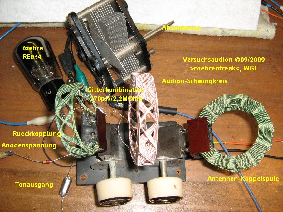 Ach so - fast vergessen: Arbeitet das Audion nach Korrektur der Schaltung des Gitterableitwiderstandes jetzt zufriedenstellend? Mein neuerlicher Versuchsaufbau, anknüpfend an unseren gestrigen Versuch mit Deinen Spulen und Deiner Röhre, klappt hier sehr gut. Es kommen -zig Sender ´rein.