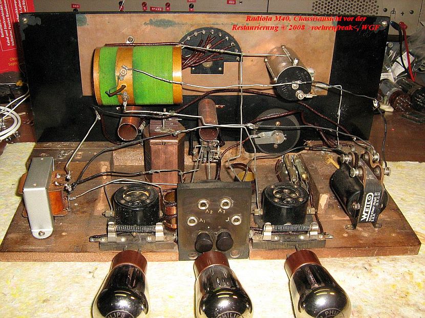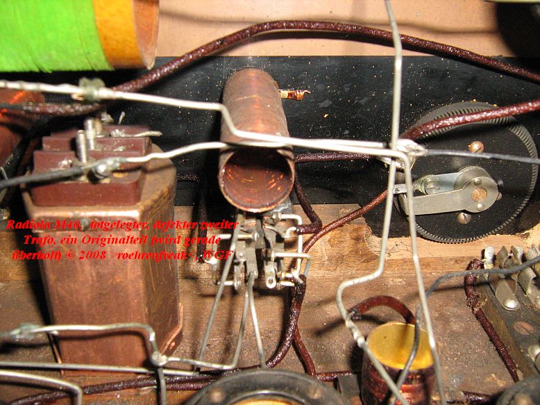 Dabei hast Du uns zur Reparatur meines Radiola M40 gute und wertvolle Tips gegeben. Nachdem inzwischen Bernhard einen Netzttrafo für den M40 gebaut hat, ist er jetzt bei Jürgen rf ("roehrenfreak") in guten Händen und wird in Zusammenarbeit mit JürgenH. (JHG) auf seine Premiere (Empfang eines oder vielleicht sogar mehrerer Sender) technisch vorbereitet.