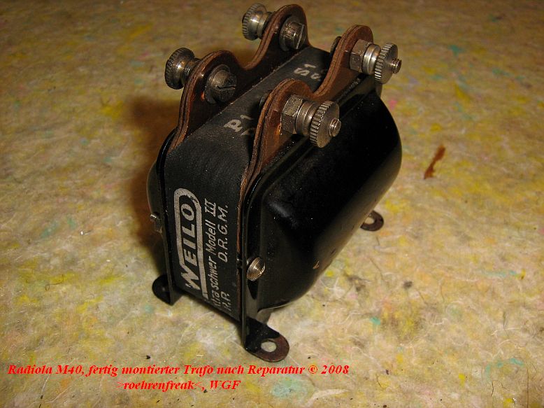 ja - und hier sind sie, die ersten Bilder zur Restaurierung des schönen Radiola M40. Wir sind sehr zuversichtlich, ihm schon bald wieder frische Töne zu entlocken. Die Reparatur von Koppel-Trafos ist natürlich eine langwierige Angelegenheit wenn, wie im vorliegenden Fall, so an die 5000 oder mehr Windungen hauchdünnen Drahtes von Hand gewickelt werden müssen...