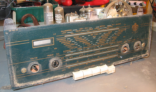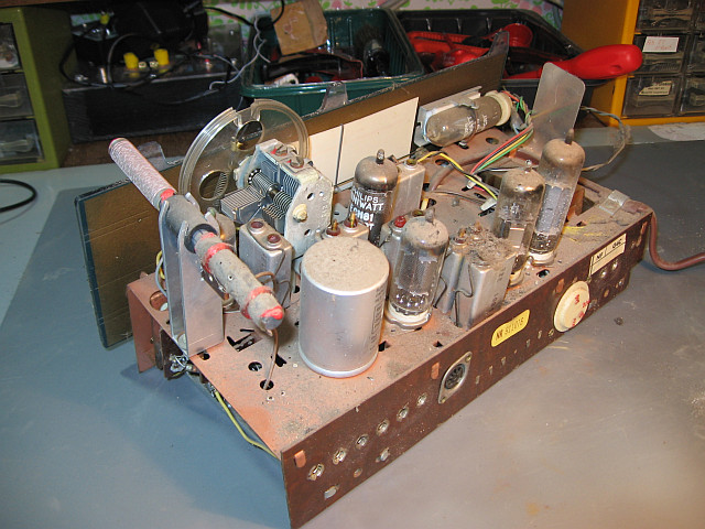 Ich werde dann den üblichen Weg der Restaurierung einschlagen: Chassis ausbauen, Gehäuse aufarbeiten, Teile reinigen, das Kunststoffskalenglas polieren, Teile reinigen und polieren, Skalenseile ersetzen, verdächtige Bauteile tauschen, Röhren überprüfen und so weiter.