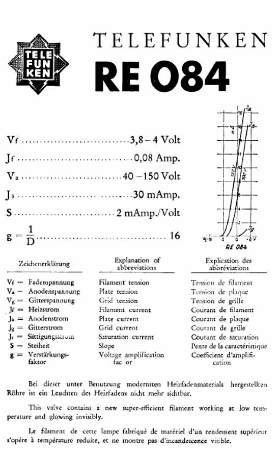 für deine Information zur Beschriftung auf der Röhre bedanke ich mich. Ich hätte nicht gedacht, dass die Röhre "RE 084" auch noch im Jahr 1939 produziert wurde. Meine Vermutung, dass die Röhre im Volksempfänger verwandt wurde, hat sich nach meiner nachträglichen Recherche nicht bestätigt. Ich werde entsprechend deiner Aussage zum Aufdruck in der alten militärischen Funktechnik recherchieren, ob die Röhre dort zum Einsatz kam. Für eine Tauglichkeitsprüfung der Röhre, habe ich Daten gefunden.