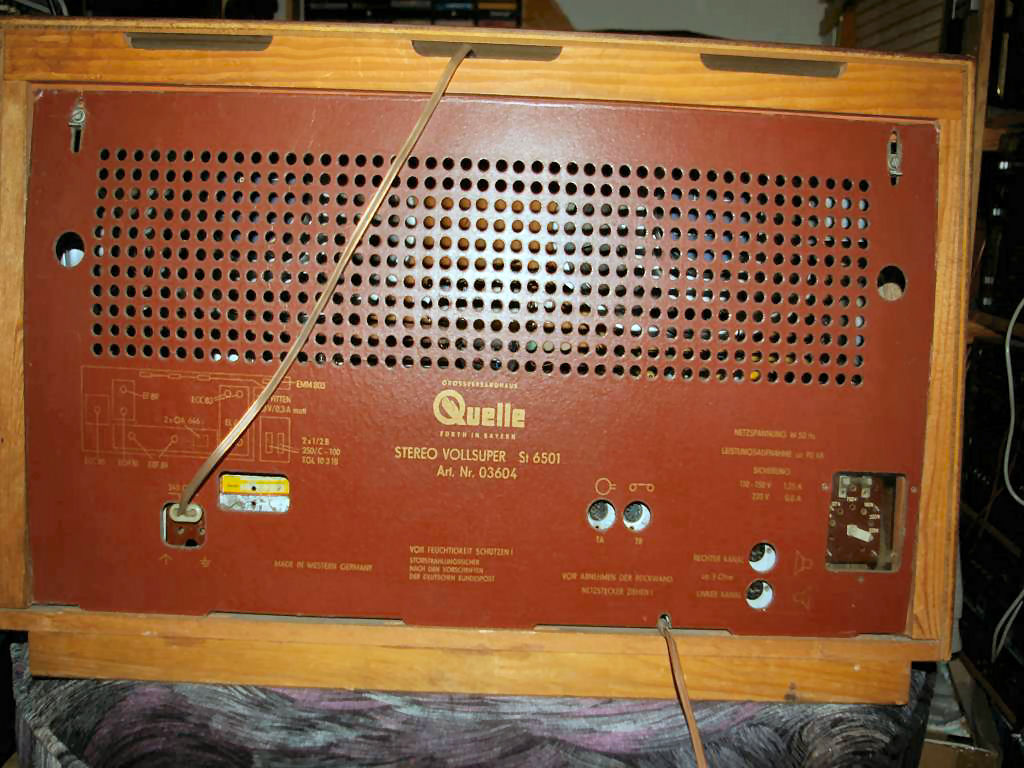 Ich möchte einen Großsuper von Quelle vorstellen. Hergestellt wurde das Gerät 1965 und unter der Bezeichnung "Stereo Vollsuper St 6501", Artikelnummer 03604 in den Handel gebracht. Die Rückwand weist als Herstellungsort "Made in Western Germany" aus. Interessant ist der Hinweis auf die Verwendung von Normteilen nach TGL, dem verbindlichen Normenwerk der DDR.