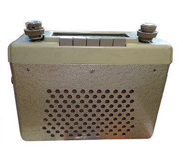 Ein schon erwähnenswertes Kofferradio, da es zur Übergangs-Generation vom Röhrenradio zum Transistorradio gehört. Kam um 1958 heraus und hatte einen Transistor-Spannungswandler, also keinen Verhacker oder Anodenbatterie mehr.