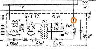 wenn ich mir den Anodenspannungskonverter ansehe, handelt es sich um einen harmonischen Oszillator mit Spannungsverdopplung. Die NF-Drossel DR2 in der Speiseleitung und die Schwingkreiskapazität weisen auf Schwingfrequenz im Ultraschallbereich hin. Üblich war der Bereich um 50 kHz. Üblicherweise waren solche Konverter total in ein Blechgehäuse eingelötet, kapazitiv verblockt und verdrosselt, also HF-dicht. EMV => gut beherrschbar. Das Schaltbild ist fehlerhaft, siehe Ausschnitt. Zwar war es üblich, die Schaltung so auszulegen, daß die Betriebsspannung zur Ausgangsspannung addiert wird, doch hier wird die Ausgangsspannung mit der Betriebsspannung kurzgeschlossen.
